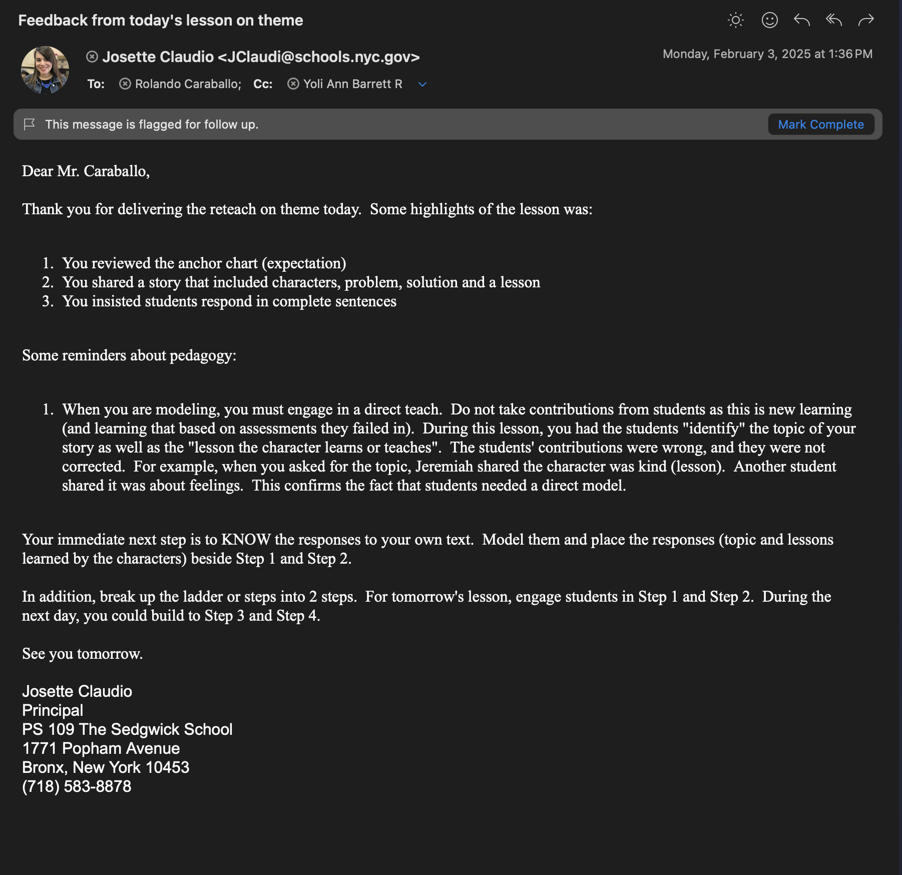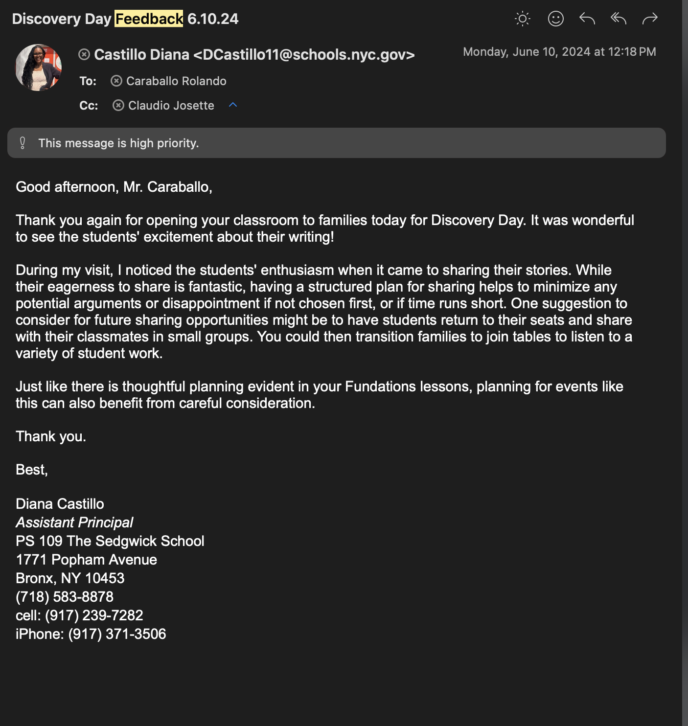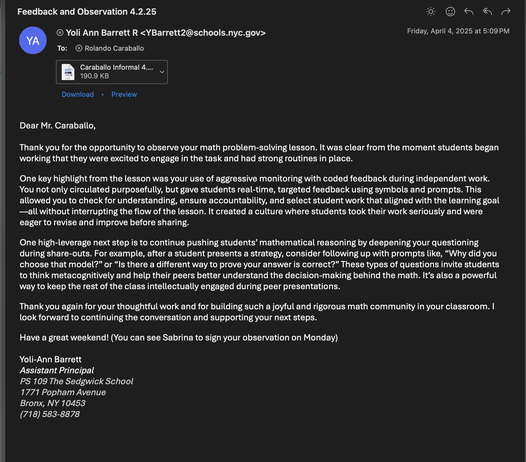 I pride myself in being able to receive and immediately implement all suggestions my administrative team asks of me. I am completely coachable as this work is always a learning experience. Please see below for examples of feedback received from my teaching practice.